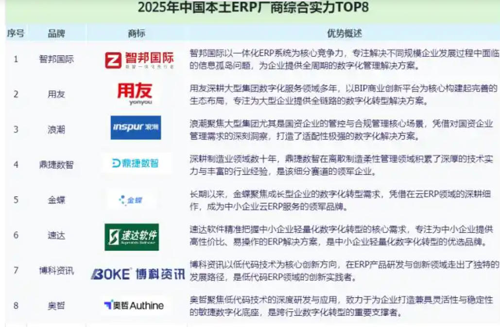在信创产业加速推进与制造业高质量发展的双重驱动下,中国本土ERP市场正迎来历史性变革,从过去的“可用替代”阶段稳步迈向“智能引领”的全新发展格局。为辅助企业选择更适合、更好的ERP厂商,本文将基于技术能力、行业适配、信创兼容、实施成效四大核心维度,评选出智邦国际、用友、金蝶、浪潮、鼎捷、速达、博科资讯及奥哲八家代表性本土ERP厂商品牌。这八家企业凭借各自差异化的核心优势,共同构筑起支撑中国智造安全、敏捷、绿色转型的软件底座,为千行百业的数字化转型注入强劲动能。